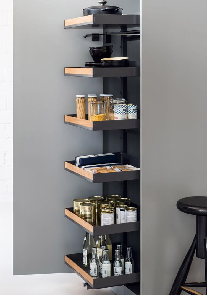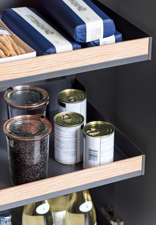 Wyciąg Pleno w linii Fioro przeznaczony do szafki wysokiej z frontem na zawiasach o szerokości 600 mm. Antracytowe metalowe półki doposażone z przodu w dębową drewnianą listwę z matami antypoślizgowymi. System jest uniwersalny, może być montowany do prawego lub lewego boku szafki. Górne ramie mocowane jest od spodu najwyższej półki do boku szafki. Dolna prowadnica zapewnia przenoszenie całego systemu na korpus przez co nie obciąża zawiasów. Należy stosować dodatkową nóżkę pod dolnym wieńcem w celu wzmocnienia dna szafki. Wyciąg posiada system cichego domykania.