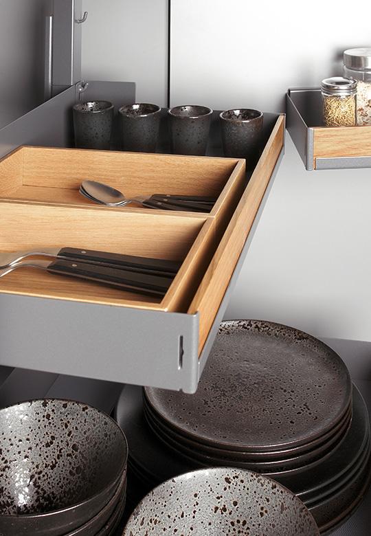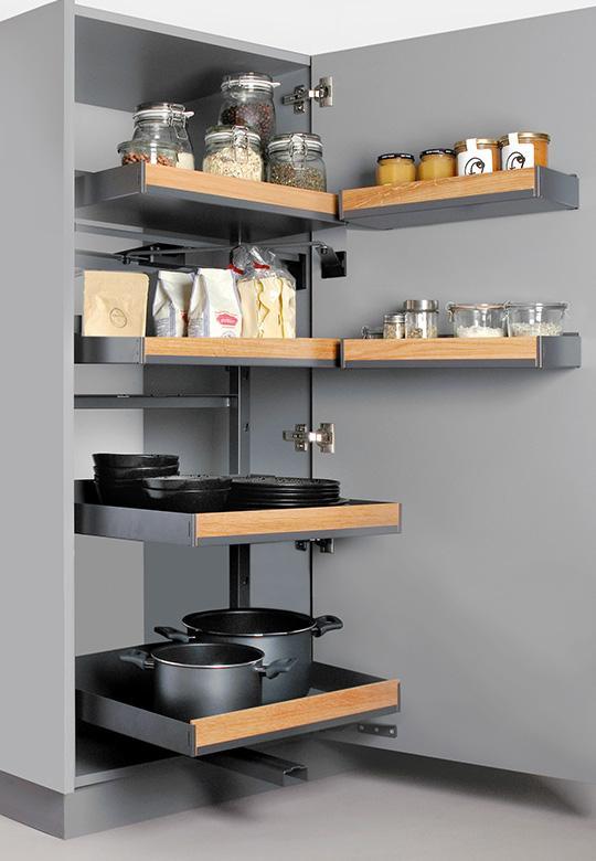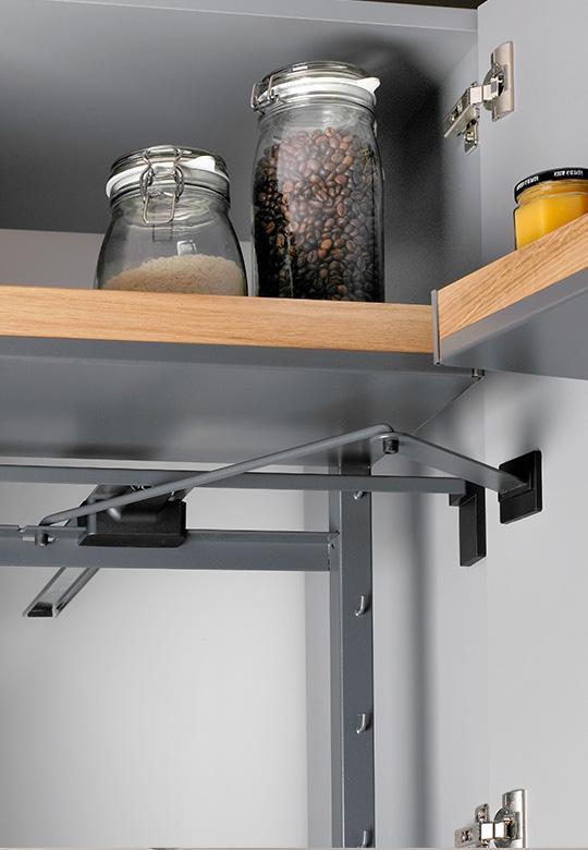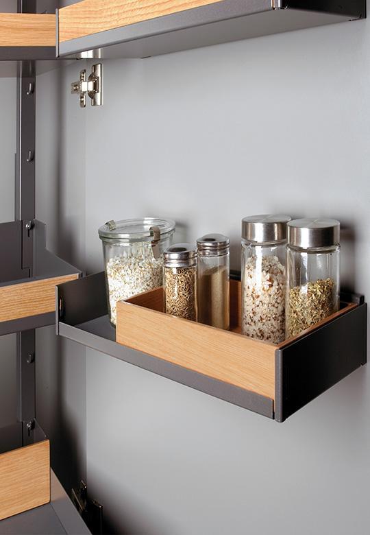 Pleno Plus Fioro w kolorze antracytowym do szafki o szerokości frontu 600 mm i głębokości 500 mm. Całkowita wysokość systemu to 1104 mm. Minimalne światło szafki to 1120 mm. Wyciąg przeznaczony do szafki wysokiej z frontem na zawiasach. Posiada kombinację wielkości półek co daje doskonały przegląd zawartości na każdym poziomie. System został podzielony na dwie strefy przechowywania, górna jako spiżarnia np. na artykuły spożywcze, natomiast dolna z większymi półkami na przechowywanie większych przedmiotów jak np. małe AGD lub talerze.