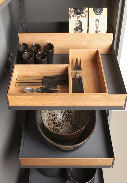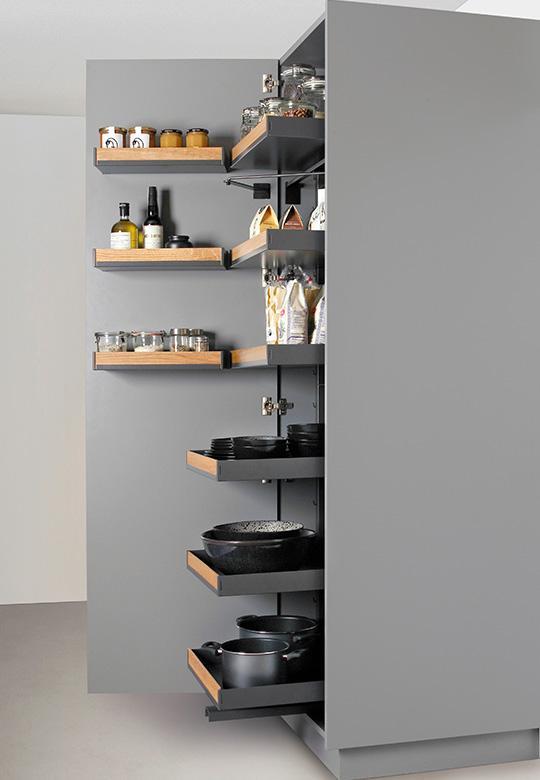 Pleno Plus Fioro w kolorze antracytowym do szafki o szerokości frontu 600 mm i głębokości 500 mm. Całkowita wysokość systemu to 1715 mm. Minimalne światło szafki to 1720 mm. Wyciąg przeznaczony do szafki wysokiej z frontem na zawiasach. Posiada kombinację wielkości półek co daje doskonały przegląd zawartości na każdym poziomie. System został podzielony na dwie strefy przechowywania, górna jako spiżarnia np. na artykuły spożywcze, natomiast dolna z większymi półkami na przechowywanie większych przedmiotów jak np. małe AGD lub talerze.