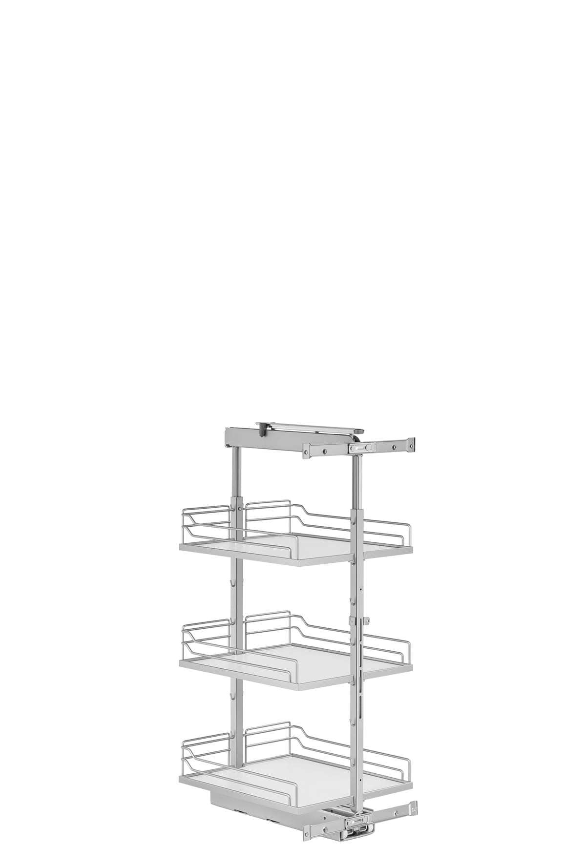 Wyciąg wysoki do szafki typu cargo o szerokości frontu 450 mm i wysokości ramy w przedziale 900-1200 mm. Komplet dostępny jest z koszami w linii ARENA Classic Silver z okrągłymi malowanymi proszkowo srebrnymi relingami. Drewniane dno koszy w kolorze szarym, pokryte jest antypoślizgową przezroczystą powłoką. Koszyki można zawieszać na ramie w odległości co 10 cm. Prowadnica z pełnym wysuwem . Wyciąg posiada system cichego domykania. W celu optymalnego funkcjonowania systemu zaleca się stosowanie hamulca Soft Stopp Pro 01.265.S, który wyhamuje cargo w momencie otwierania. W przypadku otwierania szafki bezuchwytowo należy osobno zamówić system elektryczny eTouch.