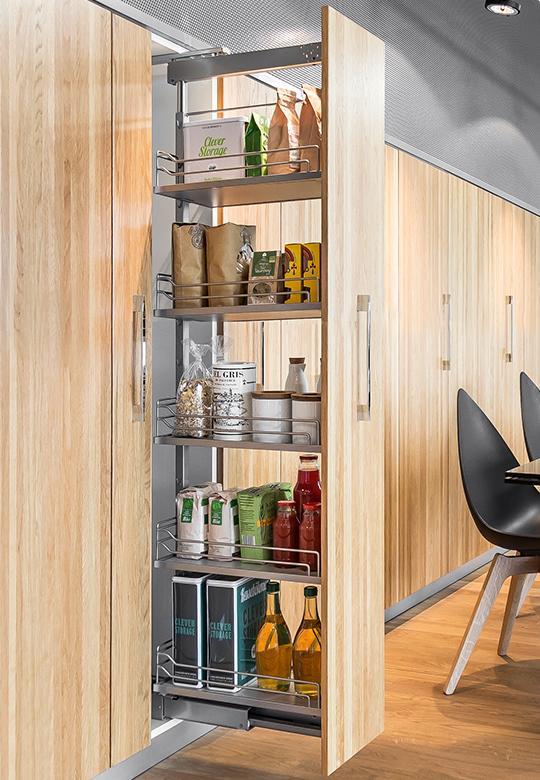 Wyciąg wysoki do szafki typu cargo o szerokości frontu 450 mm i wysokości ramy w przedziale 1600-1900 mm. Komplet dostępny jest z koszami w linii ARENA Classic Silver z okrągłymi malowanymi proszkowo srebrnymi relingami. Drewniane dno koszy w kolorze szarym, pokryte jest antypoślizgową przezroczystą powłoką. Koszyki można zawieszać na ramie w odległości co 10 cm. Prowadnica z pełnym wysuwem . Wyciąg posiada system cichego domykania. W celu optymalnego funkcjonowania systemu zaleca się stosowanie hamulca Soft Stopp Pro 01.265.S, który wyhamuje cargo w momencie otwierania. W przypadku otwierania szafki bezuchwytowo należy osobno zamówić system elektryczny eTouch.