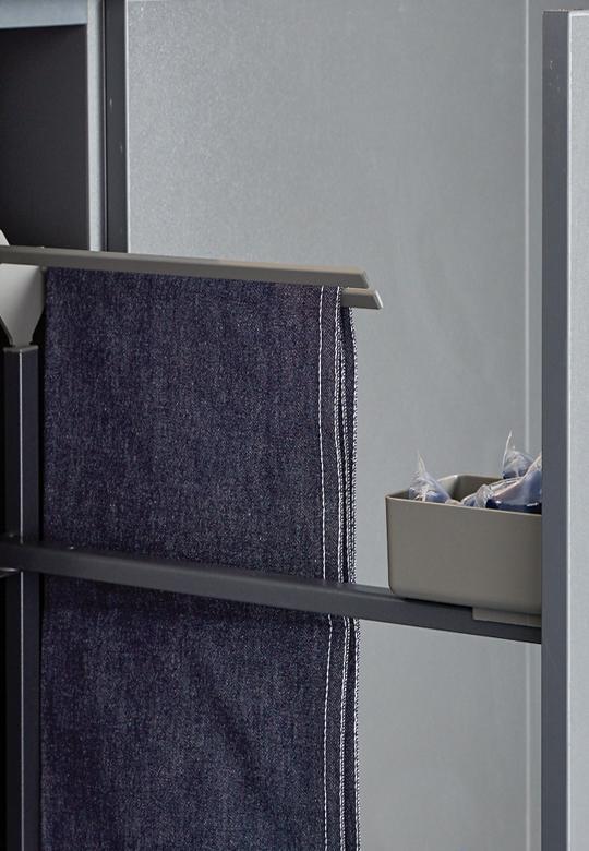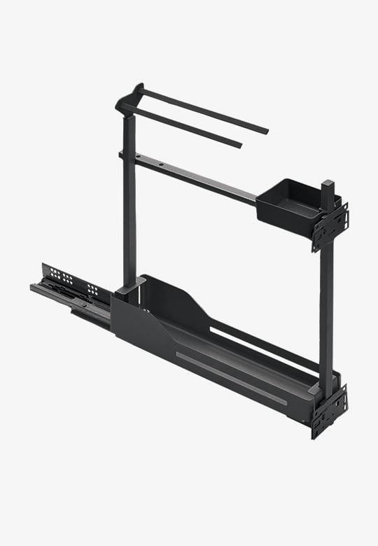 Wyciąg podblatowy do szafki wąskiej o szerokości frontu 150 mm. Półki wykonane są w linii Libell w kolorze antracyt. Półki zostały doposażone w matę antypoślizgową, która zapobiega przesuwaniu się produktów podczas wysuwania i wsuwania, dodatkowo zabezpiecza dno półki i ułatwia utrzymanie czystości. Rama mocowana jest pod półką co umożliwia łatwy dostęp z obu stron wyciągu. Prowadnica mocowana jest zawsze z prawej strony.