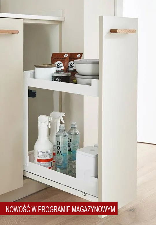 System opiera się na prowadnicy zachodniego producenta firmy Grass o długości 500 mm z pełnym wysuwem, co zapewnia bardzo wygodne korzystane z niego na co dzień. Dzięki pełnym wysuwom, przechowywane produkty kuchenne są widoczne i łatwo dostępne od razu po wysunięciu z szafki. Natomiast wbudowany mechanizm Softclose zapewnia płynne i ciche zamykanie urządzenia. System może być obsługiwany prawo / lewo, ponieważ prowadnice są umieszczone pod półkami i są praktycznie nie widoczne.