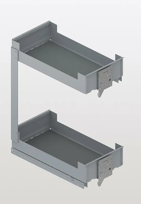 System opiera się na prowadnicy Grass o długości 500 mm z pełnym wysuwem, co zapewnia bardzo wygodne korzystane z niego na co dzień. Dzięki pełnym wysuwom, przechowywane produkty kuchenne są widoczne i łatwo dostępne od razu po wysunięciu z szafki. Natomiast wbudowany mechanizm Softclose zapewnia płynne i ciche zamykanie urządzenia. System może być obsługiwany prawo / lewo, ponieważ prowadnice są umieszczone pod półkami i są praktycznie nie widoczne.