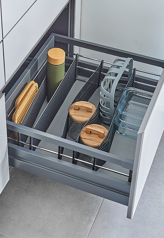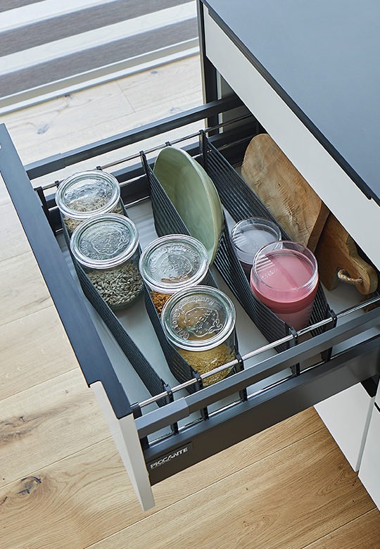 PEKA SpaceFlexx 600 to nowoczesny system organizacji wnętrza szuflad, który pozwala w prosty sposób utrzymać porządek w kuchni, garderobie, łazience lub biurze. Dzięki elastycznym przegrodom tekstylnym zawartość szuflady dopasowuje się do systemu, a nie odwrotnie, co znacząco zwiększa funkcjonalność codziennego przechowywania.