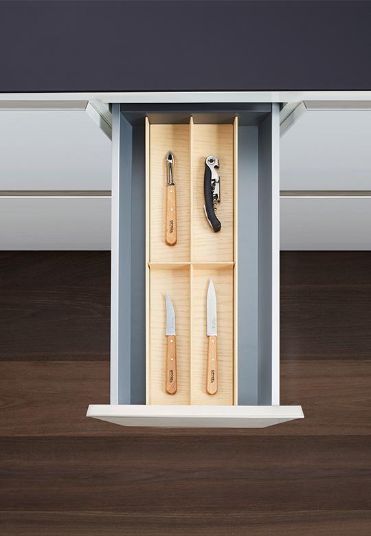 Różnorodny asortyment elementów drewnianych jaki posiadamy w ofercie umożliwia własne i indywidualne zagospodarowanie wnętrz każdej szuflady.