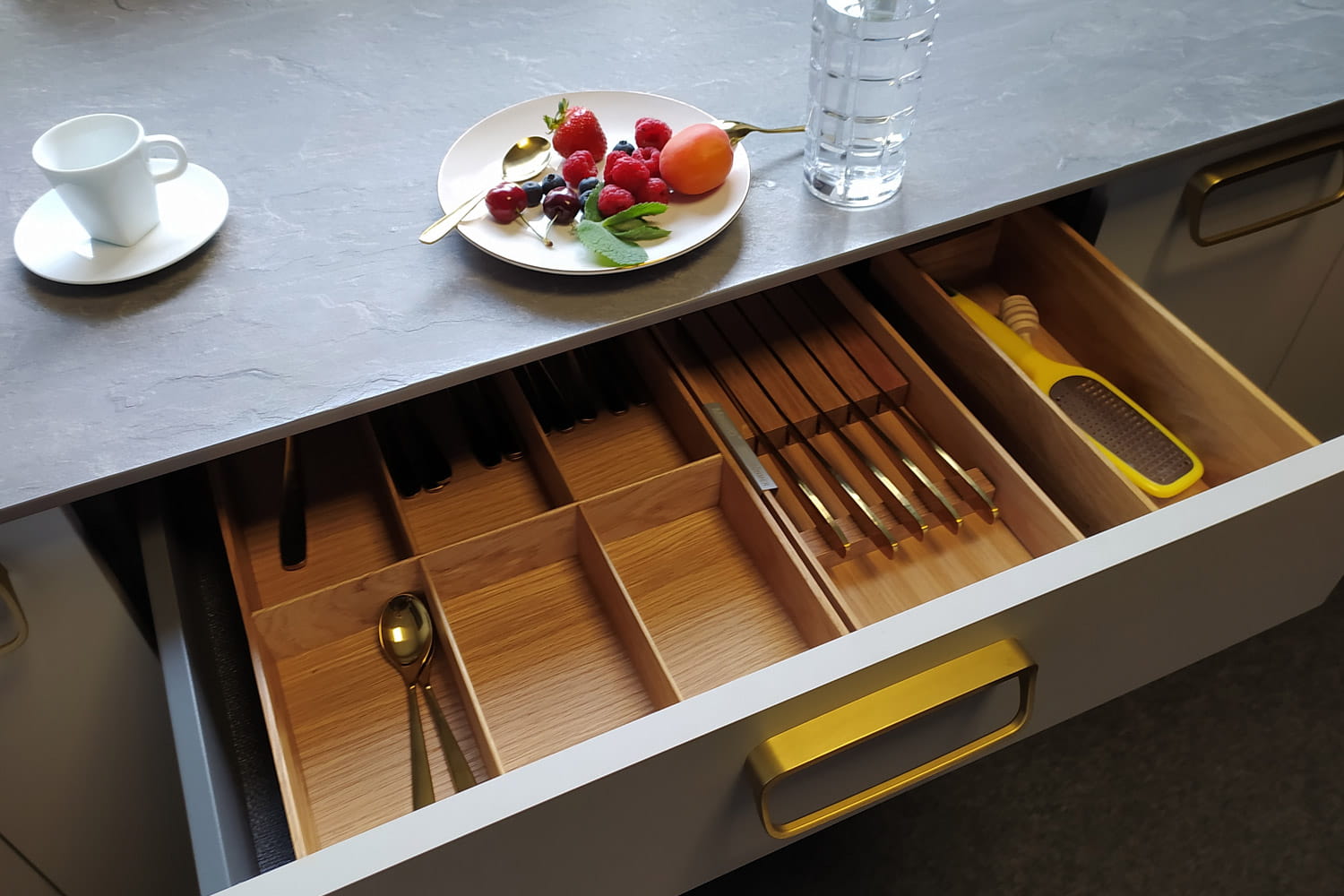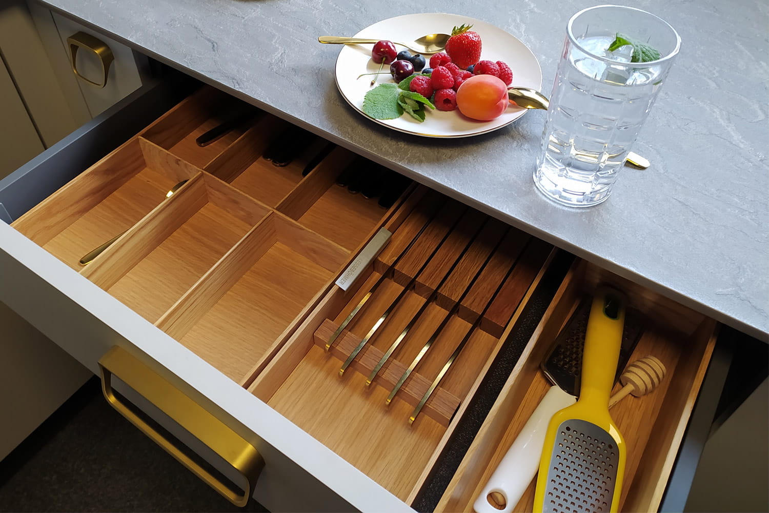Wkład do szuflady wykonany z drewna dębowego z przeznaczeniem na noże. Do wkładu należy domówić rynienkę (kod produktu 07.353.D), dzięki której otrzymujemy boczne ścianki zwiększając stabilność wkładu. Szeroki asortyment drewnianych wkładów i tacek umożliwia indywidualne zaprojektowanie wnętrz szuflady. Wkład o szerokości 137 mm, wysokości 26 mm i głębokości 472 mm. Wymiary po dołożeniu dodatkowej rynienki: szerokość 154 mm, wysokość 49 mm, głębokość 472 mm.