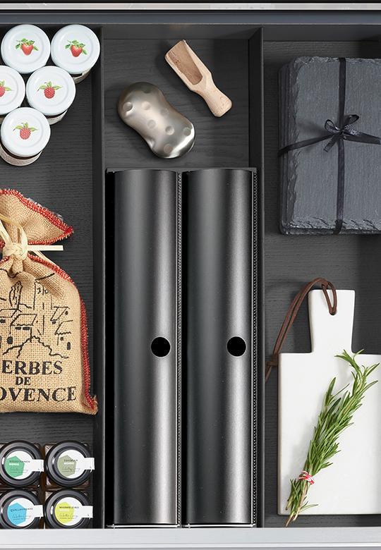 Wkład mieści dwie rolki folii w rynienkach o długości 330 mm, pasuje do standardowych szuflad i można go łączyć z innymi elementami z tej serii, tworząc spersonalizowany system organizacji. Dodatkowo dostępny jest wkład stabilizujący, który zapobiega przesuwaniu się przedmiotów w szufladzie.