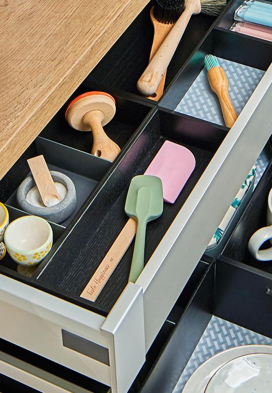 Praktyczne wyfrezowane uchwyty po bokach ułatwiają przenoszenie, dzięki czemu skrzynka świetnie sprawdzi się zarówno w szufladach, jak i na blatach. Idealna do uporządkowania drobnych akcesoriów – wszystko będzie miało swoje miejsce, a wnętrze pozostanie schludne.