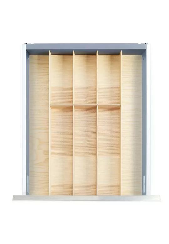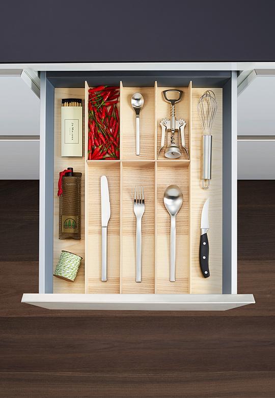 Wkład drewniany FineLine LiniQ zapewnia dużo miejsca na łyżki, widelce, noże i mniejsze sztućce. Produkty pokrewne z tej samej linii pomogą stworzyć idealny komplet organizerów do wielu szuflad do twojej kuchni.