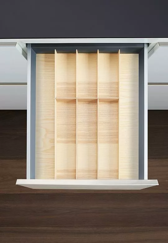 Wkład na sztućce z linii FineLine LiniQ jest wykonany z drewna dębowego, bardzo trwałego i niezwykle mocnego. Dzięki podkładkom, zestaw drewniany jest odpowiedni do każdych mebli kuchennych, do szuflad o szerokości od 400 do 450 mm i głębokości 500 mm.