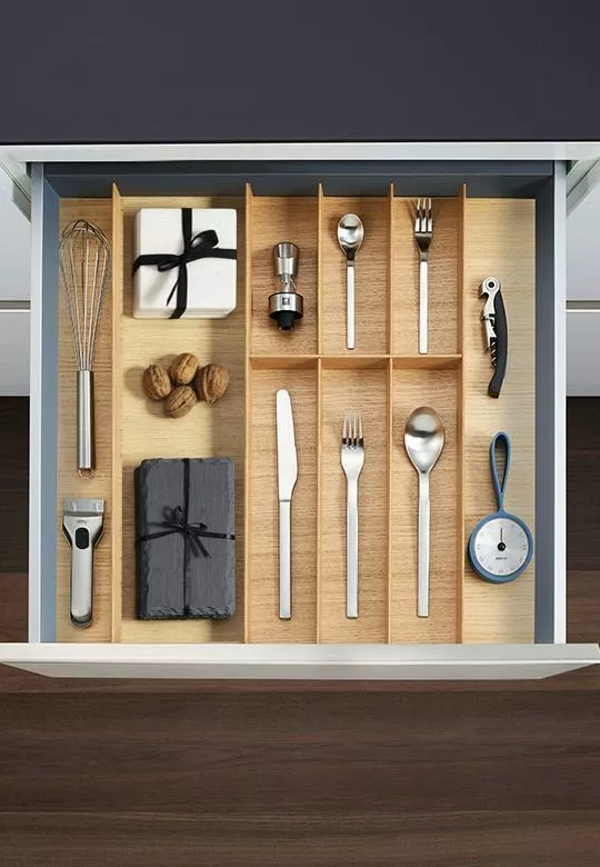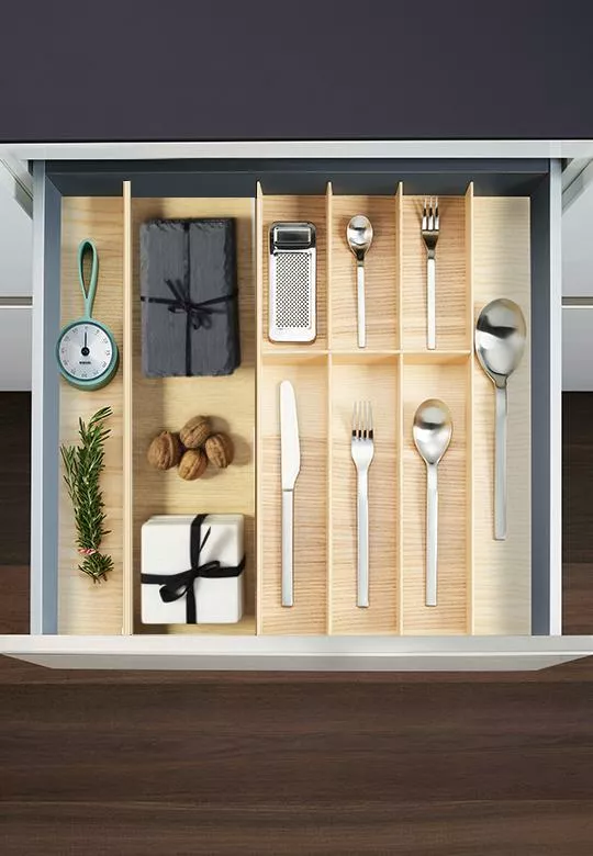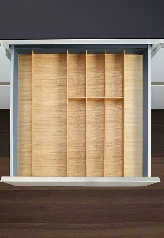 Wkład na sztućce z linii FineLine LiniQ jest wykonany z drewna dębowego, bardzo trwałego i niezwykle mocnego. Dzięki podkładkom, zestaw drewniany jest odpowiedni do każdych mebli kuchennych, do szuflad o szerokości od 500 do 600 mm i głębokości 500 mm.