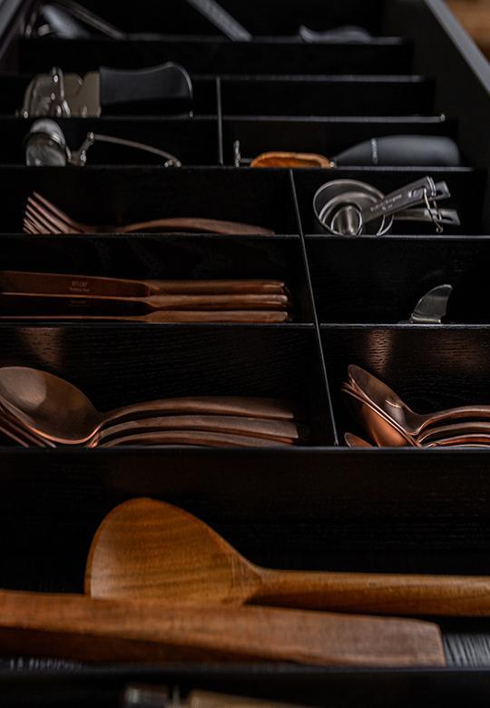 Trzyczęściowy wkład na sztućce FineLine LiniQ do szuflad o szerokości frontu 1000–1200 mm wykonany jest z czarnego drewna dębowego odpornego na wilgoć. Pasuje do szuflad o głębokości ok. 500 mm i dzięki specjalnie wyprofilowanym podkładkom można go stosować w szufladach różnych producentów.
