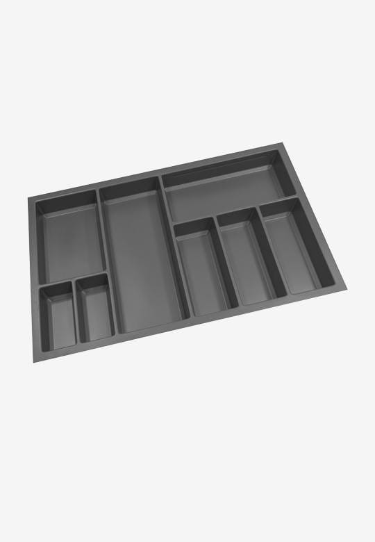Wkład na sztućce SKY wykonany z tworzywa w kolorze antracytowym. Możliwe jest zastosowanie dodatkowych przegródek, co zapewnia elastyczność wnętrza szuflady. Wkład do typowej szuflady o szerokości frontu 800 mm i głębokości prowadnicy 500 mm. Dodatkowo można go indywidualnie dociąć pod własny wymiar szuflady (posiada po 15 mm z każdej strony do docięcia).
