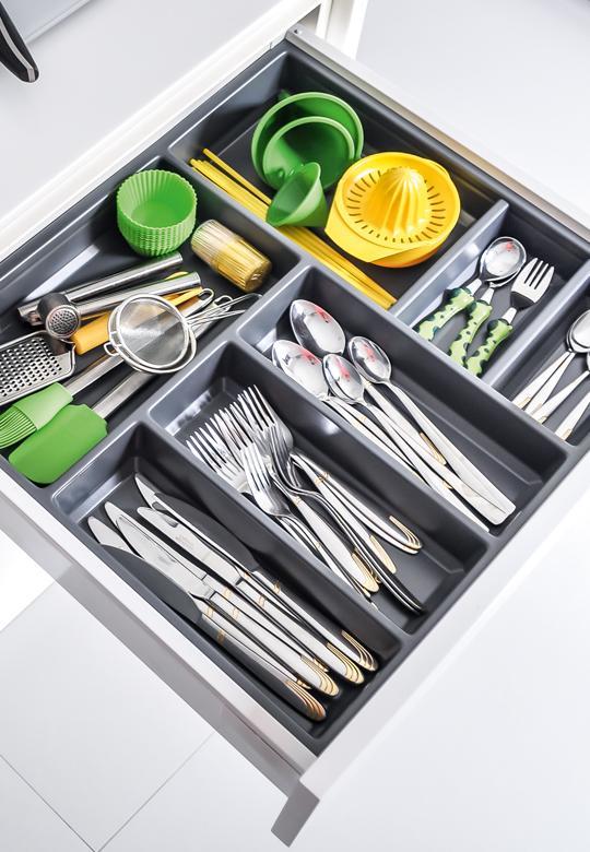Wkład na sztućce SKY wykonany z tworzywa w kolorze antracytowym. Możliwe jest zastosowanie dodatkowych przegródek, co zapewnia elastyczność wnętrza szuflady. Wkład został docięty do szuflady Legrabox o szerokości frontu 800 mm do korpusu z płyty 18 mm i głębokości prowadnicy 500 mm.