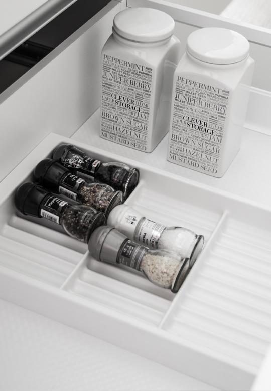 Separado to system wkładek do szuflad z przeznaczeniem na przyprawy. Prosta forma wkładu pozwala na wykorzystanie Separado w szufladach przy niestandardowych szerokościach. Można umieścić jeden lub kilka wkładów z linii Separado w jednej szufladzie w zależności od jej szerokości. Wkład dostępny jest o szerokości 300 mm i głębokości 540 mm. Istnieje możliwość w własnym zakresie docięcia wkładu na głębokość 460 mm. Wkład dostępny jest w kolorze białym.