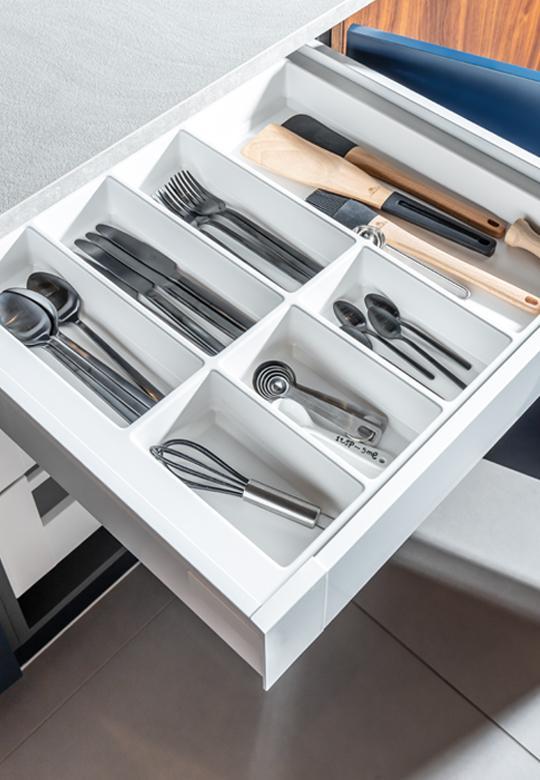Do wkładu polecamy profil wykończeniowy, który idealnie wypełnia szczeliny między bokiem szuflady a wkładem oraz niweluje ewentualne nierówności (do dokupienia, nie wchodzi w komplet z wkładem).