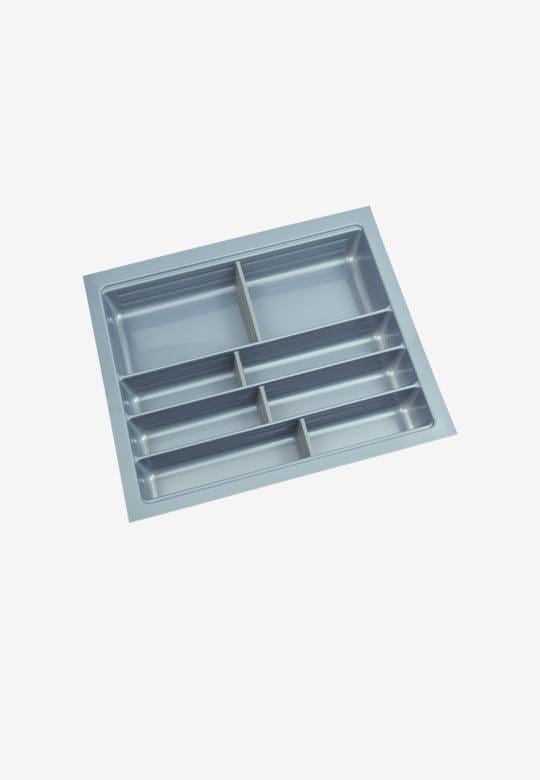 Wkład SCOOP wykonany z tworzywa z połyskiem w kolorze szarym. Wkład do typowej szuflady o szerokości frontu 600 mm i głębokości prowadnicy 500 mm. Dodatkowo można go indywidualnie dociąć pod własny wymiar szuflady (posiada po 20 mm z każdej strony do docięcia). Do wkładu dokładany jest 1 komplet podziałek (3 krótkie+ 1 długa).