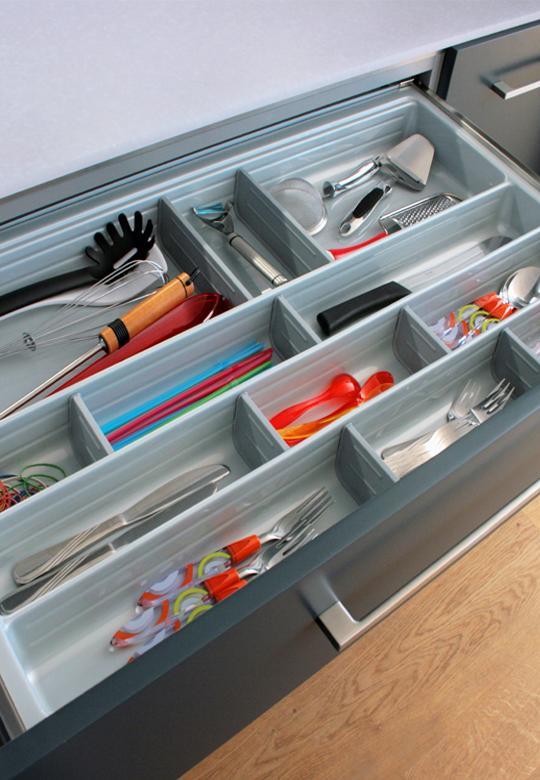 Organizer na sztućce SCOOP do szuflady o szerokości frontu 1000 mm i głębokości prowadnicy 500 mm, wykonany z trwałego, szarego tworzywa z połyskiem (918 × 474 × 60 mm). Pasuje do szuflad Antaro z korpusu 18 mm. Wytłoczka posiada komory ustawione równolegle do frontu, co chroni sztućce przed uderzeniami. W komplecie 12 podziałek (3 długie, 9 krótkich), które umożliwiają dostosowanie układu do różnych przyborów kuchennych. Organizer jest lekki, bezzapachowy, odporny na pęknięcia, łatwy do czyszczenia (również w zmywarce). Chroni dno szuflady i pomaga w utrzymaniu porządku. Dostępne akcesoria dodatkowe: profil wykończeniowy (07.999.B) i dodatkowe przegrody (do dokupienia osobno).