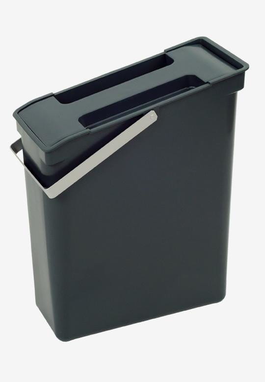 Pojemnik na odpady. Pojemnik o kształcie prostokątnego trapezu, został zaprojektowany po to aby maksymalnie wykorzystać przestrzeń dostępną w szafce ze zlewozmywakiem. Smukły kształt pojemnika pozwala na zestawianie go z innymi pojemnikami tworząc dowolną kombinację w istniejącej szafce lub szufladzie, tym samym zapewniając pełną segregację odpadów. Wykonany z dobrego jakościowo, wytrzymałego tworzywa sztucznego, pozbawionego brzydkiego zapachu. Solidny, odporny na odkształcenia i pęknięcia. Wyposażony w szeroki metalowy uchwyt transportowy, który również przytrzymuje worek na śmieci.Łatwy w utrzymaniu czystości. Pojemnik w zestawie z pokrywką. Wymiary pojemnika u podstawy: 160 mm x 340 mm, wysokość boku wyższego: 420 mm, wysokość boku niższego 345 mm (podane wymiar dotyczą pojemnika ze złożonym uchwytem). Pojemność 20 litrów. Dla pełnego komfortu użytkowania należy stosować worki o pojemności min. 1,5 razy większej niż pojemność pojemnika. Pojemnik świetnie sprawdzi się jako sortownik na odpady na: opakowania po produktach spożywczych, butelki po napojach, kartoniki po sokach, kubeczki po jogurtach, puszki, papier, szkło ale również doskonały będzie na bioodpady kuchenne.