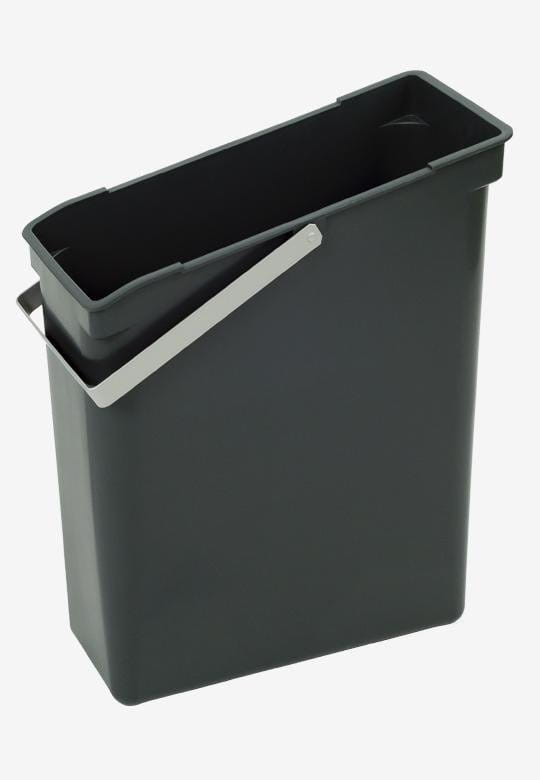 Pojemnik na odpady. Pojemnik o kształcie prostokątnego trapezu, został zaprojektowany po to aby maksymalnie wykorzystać przestrzeń dostępną w szafce ze zlewozmywakiem. Smukły kształt pojemnika pozwala na zestawianie go z innymi pojemnikami tworząc dowolną kombinację w istniejącej szafce lub szufladzie, tym samym zapewniając pełną segregację odpadów. Wykonany z dobrego jakościowo, wytrzymałego tworzywa sztucznego, pozbawionego brzydkiego zapachu. Solidny, odporny na odkształcenia i pęknięcia. Wyposażony w szeroki metalowy uchwyt transportowy, który również przytrzymuje worek na śmieci. Łatwy w utrzymaniu czystości. Wymiary pojemnika u podstawy: 160 mm x 340 mm, wysokość boku wyższego: 420 mm, wysokość boku niższego 345 mm (podane wymiar dotyczą pojemnika ze złożonym uchwytem). Pojemność 20 litrów. Dla pełnego komfortu użytkowania należy stosować worki o pojemności min. 1,5 razy większej niż pojemność pojemnika. Pojemnik świetnie sprawdzi się jako sortownik na odpady na: opakowania po produktach spożywczych, butelki po napojach, kartoniki po sokach, kubeczki po jogurtach, puszki, papier, szkło ale również doskonały będzie na bioodpady kuchenne. Dopełnieniem pojemnika może być pokrywka (nie wchodzi w skład z pojemnikiem), polecana szczególnie do pojemników z przeznaczeniem na odpadki organiczne i resztki jedzenia.