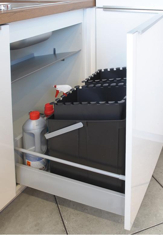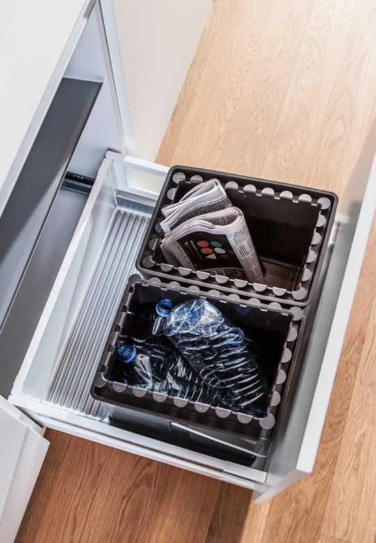 Zestaw pojemników wstawianych do szuflady jest elastycznym rozwiązaniem segregacji odpadów w szufladzie. Zestaw do szerokości frontu 600 mm zawiera dwa pojemniki 22 litrowe, metalową pokrywę mocowaną do boków szafki, oraz wytłoczkę na dno szuflady stabilizującą pojemniki dociętą do szuflady Antaro do korpusu z płyty 18 mm. Każdy z pojemników dodatkowo posiada pierścień dzięki, któremu możliwe jest zwiększenie pojemności na 26 litrów.