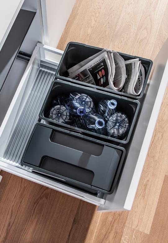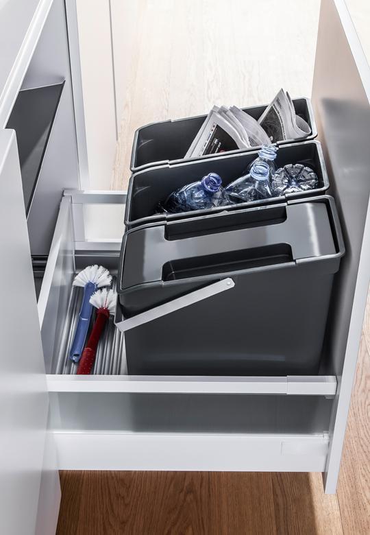 Zestaw pojemników wstawianych do szuflady jest elastycznym rozwiązaniem segregacji odpadów w szufladzie. Zestaw do szerokości frontu 600 mm zawiera trzy pojemniki 20 litrowe, oraz wytłoczkę na dno szuflady stabilizującą pojemniki dociętą do szuflady Antaro do korpusu z płyty 18 mm. Jeden z pojemników posiada własną pokrywkę.