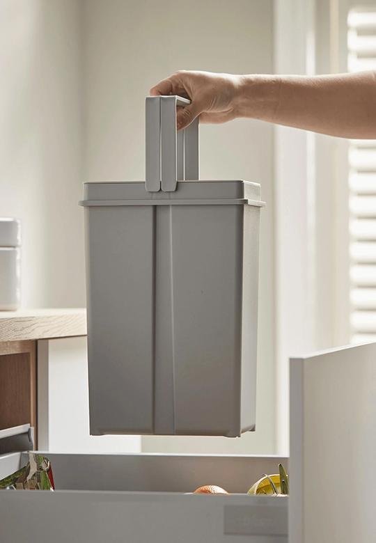 Kosze wykonano z trwałego tworzywa w kolorze jasnoszarym, z wygodnymi, podwójnymi uchwytami. Do zestawu dołączona jest metalowa, stała pokrywa, która ogranicza wydzielanie zapachów i może służyć jako dodatkowa półka.