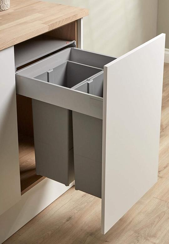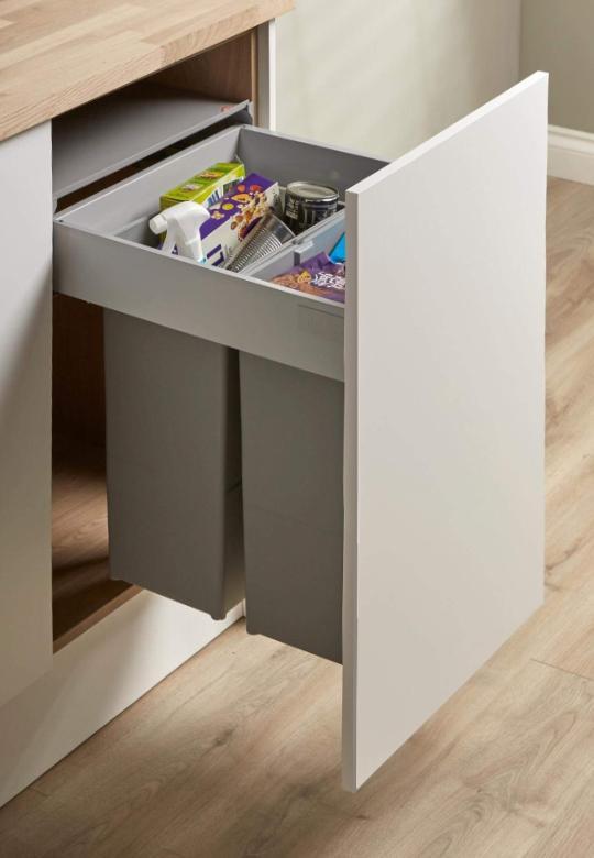 Pojemniki wysuwają się razem z frontem, ułatwiając sortowanie odpadów. Zestaw nie zawiera śrub montażowych ani szafki – mebel należy wykonać we własnym zakresie. Zdjęcia mają charakter poglądowy.