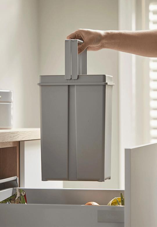 Zestaw zawiera metalową ramę ze stabilizatorem, dwa pojemniki z trwałego tworzywa (jasnoszare, z wygodnymi uchwytami), szufladę Blum Antaro 500 M z pełnym wysuwem i systemem Soft-Close (obciążenie do 30 kg) oraz metalową pokrywę mocowaną na stałe, która może służyć jako dodatkowa półka.