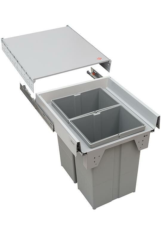 W zestawie: metalowa rama ze stabilizatorem, dwa trwałe pojemniki (jasnoszare, z uchwytami), szuflada Blum Antaro 500 M z pełnym wysuwem i Soft-Close (obciążenie do 30 kg) oraz metalowa pokrywa mocowana na stałe, która może służyć jako dodatkowa półka.
