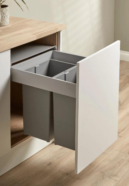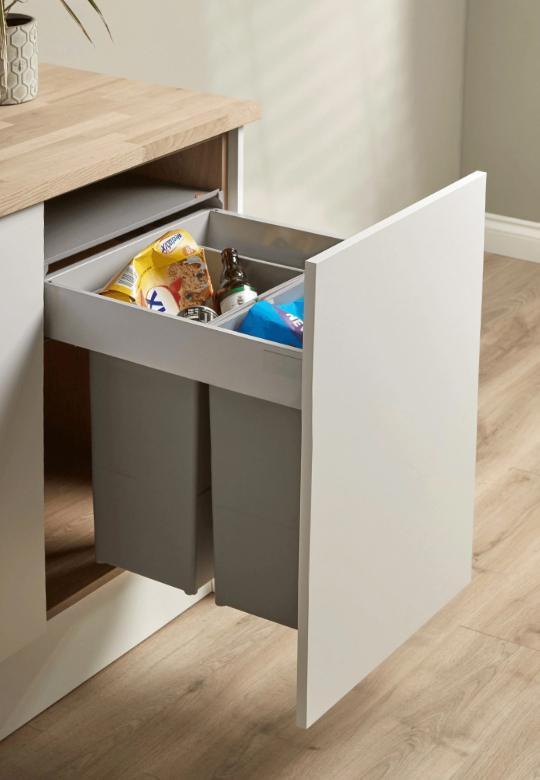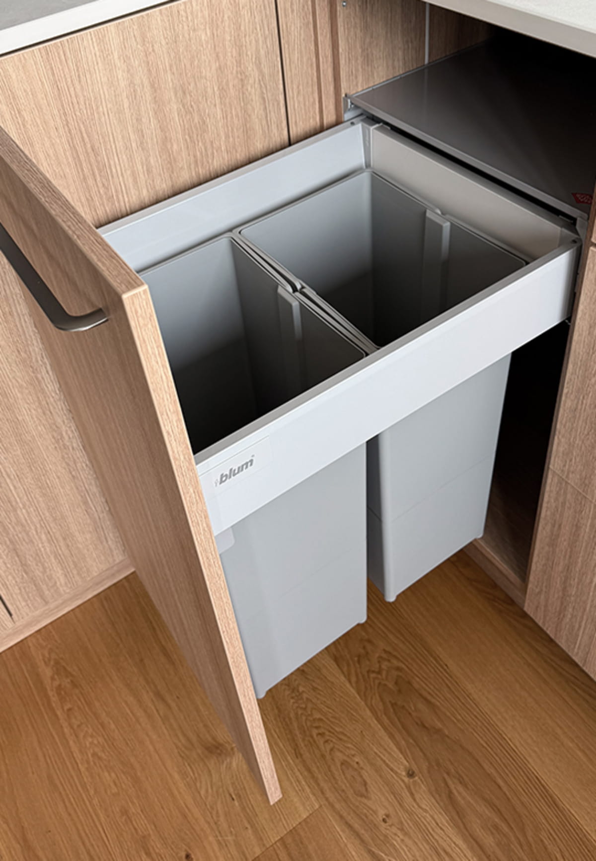 Pullboy Z 500 mm (2 x 29L / 58L) to zestaw pojemników do szafek z wysokim frontem o szerokości 500 mm (światło szafki: 462–468 mm). Wymaga głębokości min. 505 mm i wysokości wewnętrznej min. 550 mm. System mocowany jest do frontu, dzięki czemu pojemniki wysuwają się razem z nim – idealne do sortowania odpadów.