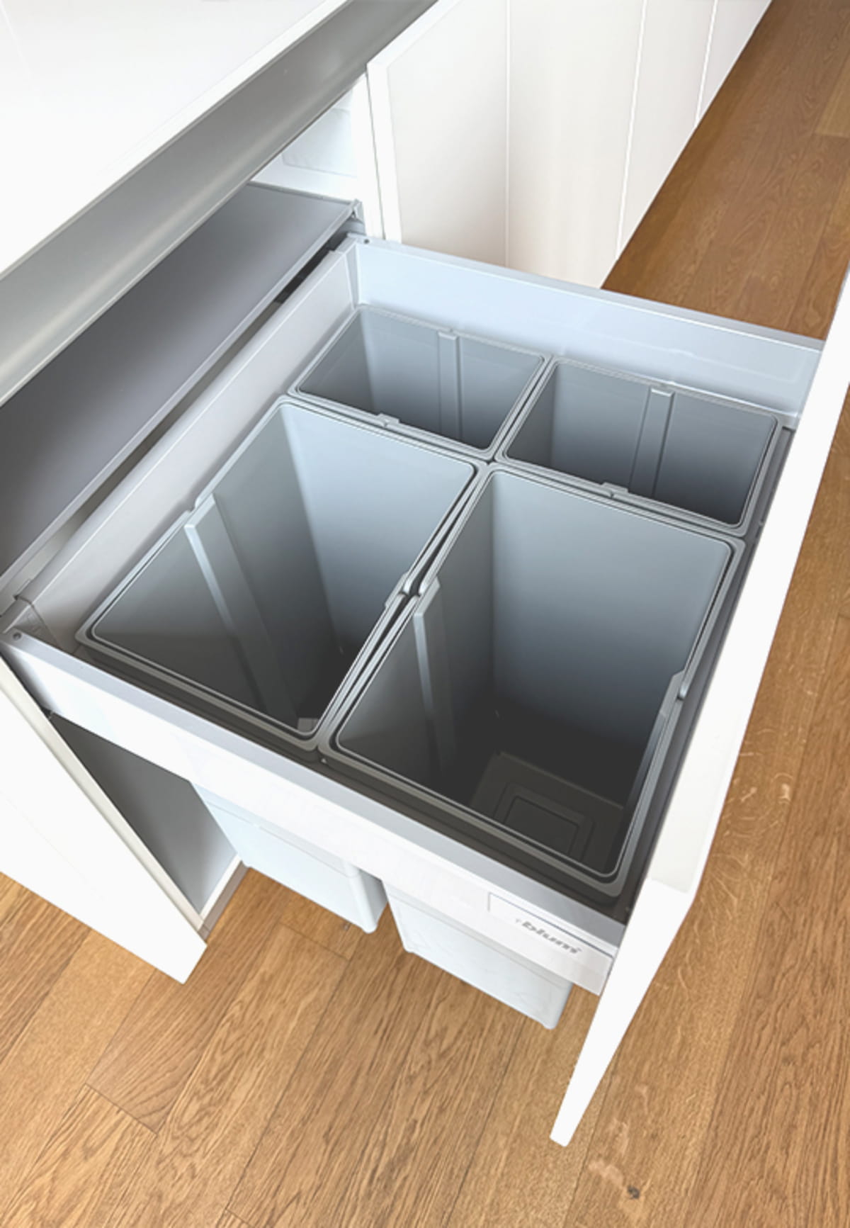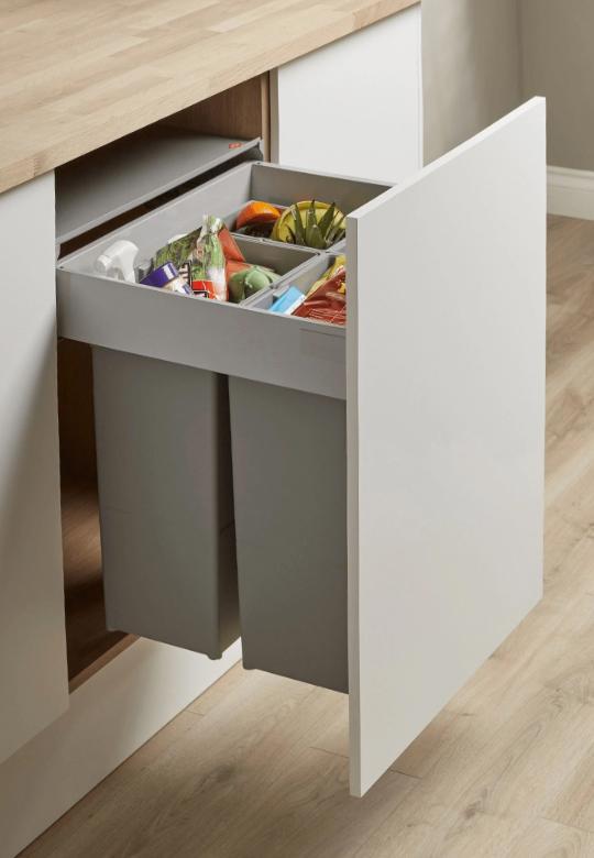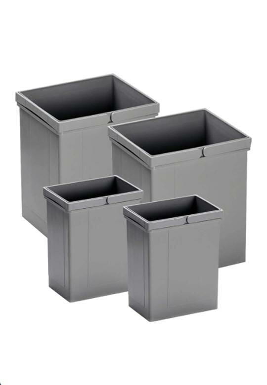 Pullboy Z 600 mm (74L: 2 x 29L + 2 x 8L) to zestaw sortowników do szafek z wysokim frontem o szerokości 600 mm (światło szafki: 562–568 mm). Wymaga min. 505 mm głębokości i ok. 550 mm wysokości wewnętrznej. System mocowany do frontu – pojemniki wysuwają się razem z nim, co ułatwia segregację odpadów.