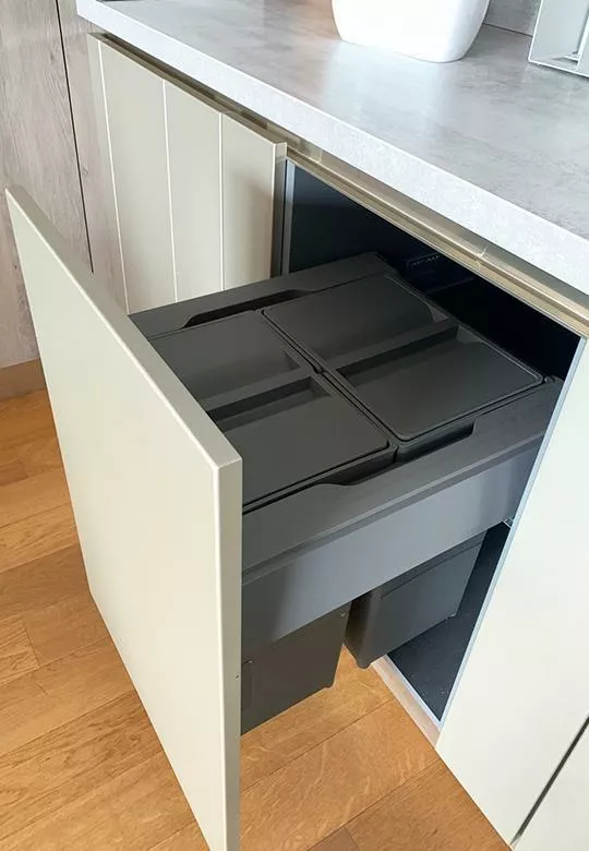 Kosz jest bardzo praktyczny w użytkowaniu ponieważ podczas otwierania szuflady, pojemniki wysuwają się jednocześnie z frontem. Wpływa to korzystnie na wygodę podczas pracy w kuchni, wystarczy tylko jeden ruch a wszystkie pojemniki są łatwo dostępne i od razu widoczne.