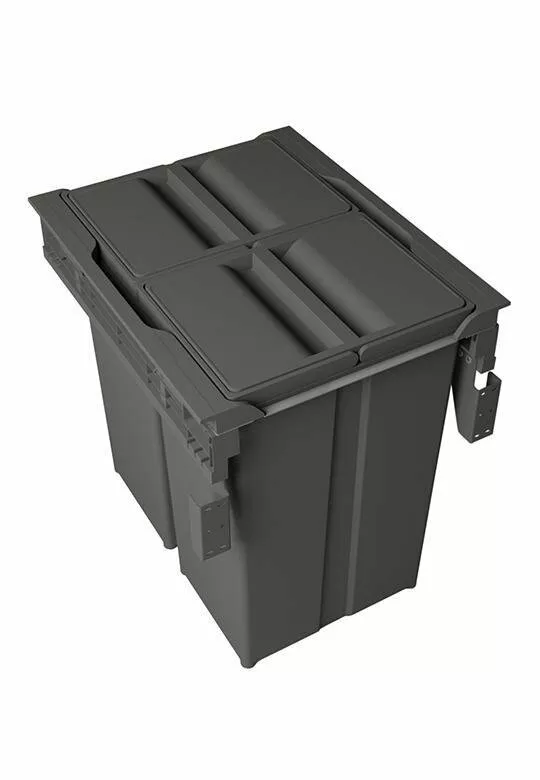 Kosz na śmieci jest do szafki o szerokości 45 cm, idealnie będzie pasował w szafce bez zlewozmywaka. Pojemniki posiadają szerokie uchwyty i własne pokrywki. Pojemniki wykonane są z dobrego i wytrzymałego tworzywa sztucznego, w kolorze antracytowym a dzięki podwójnym wzmocnionym uchwytom są bardzo łatwe do wyciągnięcia, bardzo solidne i trwałe.