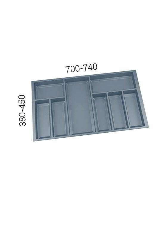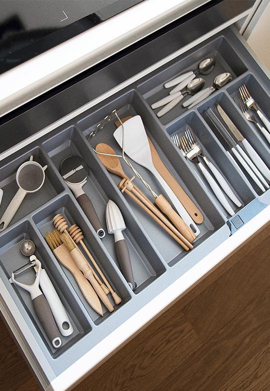 Wkład zawiera 8 komór o różnych rozmiarach – idealnych do organizacji sztućców i akcesoriów kuchennych, od łyżeczek po chochle i łopatki. Pasuje zarówno do nowoczesnych, jak i klasycznych kuchni, pomagając utrzymać porządek i estetykę w szufladzie.