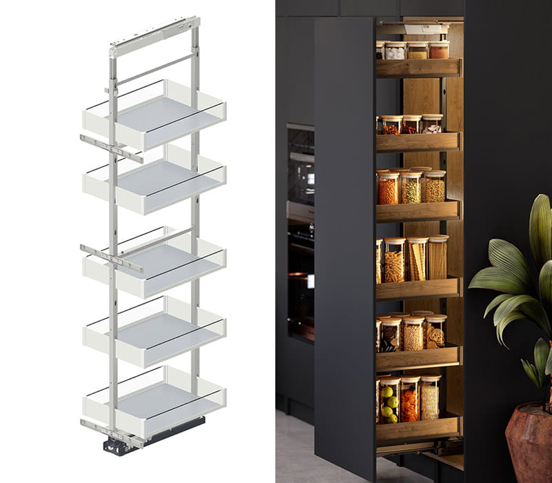 Cargo Maxima PURO maxi dolne i boczne dostosowane do szafek wysokich, zwłaszcza modnych obecnie słupków, Cargo maxi zaprojektowano z myślą o strefie przechowywania. Rozwiązanie to pozwala stworzyć podręczną i wygodną spiżarkę nawet w niewielkiej kuchni. Wyposażone jest w 5 (wersja boczna) lub nawet 6 półek (wersja dolna), na których zmieszczą się zapasy – również te duże i ciężkie. W zależności od potrzeb możemy regulować wysokość położenia półek, a także – jeśli jest taka potrzeba – dodać kolejne. Cargo Maxi dostępne jest w kilku szerokościach: 150 i 200 mm (boczne) oraz 300 i 400 (dolne). Co ważne, dzięki zastosowaniu wytrzymałego systemu jezdnego, nawet największe i w pełni obciążone cargo wsuwa i wysuwa się z korpusu lekko i komfortowo.