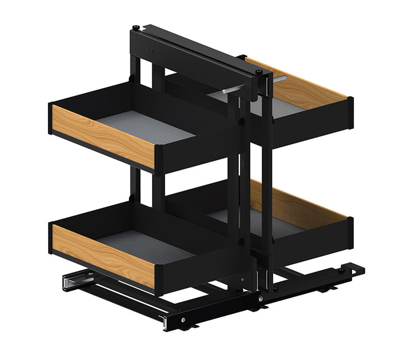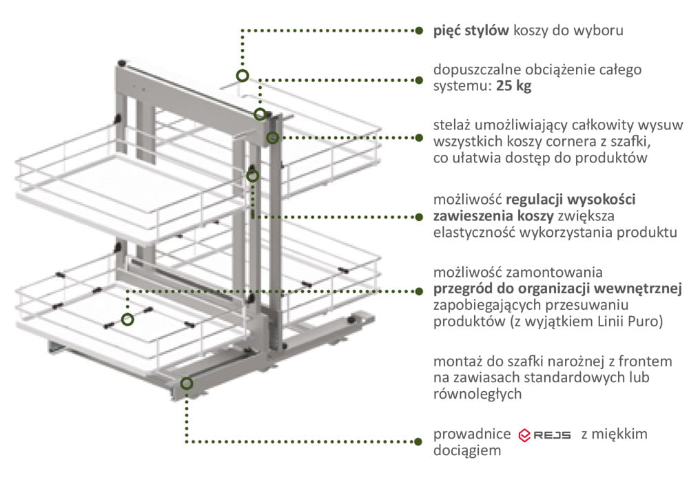 - Stelaż umożliwiający całkowity wysuw wszystkich koszy cornera z szafki
