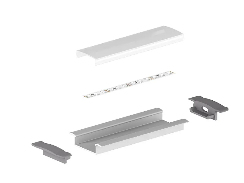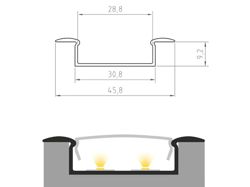 Profil wpuszczany szeroki jest profilem wpustowym mocno doświetlającym, przeznaczonym do wpuszczenia w kanał. Wykonany z wysokiej jakości anodowanego aluminium, może pomieścić dwie standardowe taśmy LED o szerokości 8 lub 10 mm. Będąc stylową obudową dla samych taśm LED, pełni również funkcję ich radiatora, dbając o dobre oddawanie ciepła.
