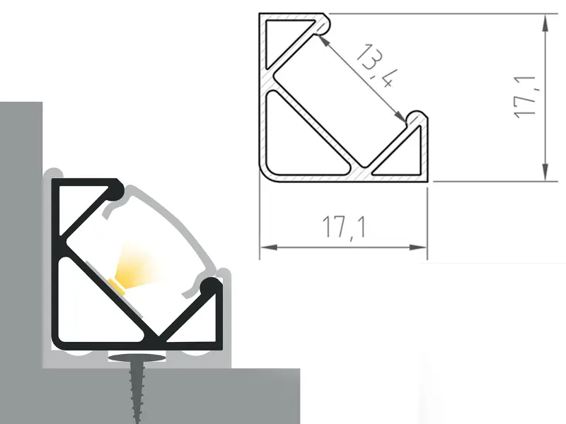 Profil nawierzchniowy kątowy jest profilem kątowym, przeznaczonym głównie do montowania w narożnikach mebli. Poprzez swój specjalny kształt, profil kieruje światło pod kątem 45°, przez co nie razi ludzi stojących naprzeciwko oprawy. Dzięki estetycznemu wykończeniu z każdej strony, profil również może być montowany blisko frontów szafek, kierując światło do ich środka. Wykonany z wysokiej jakości anodowanego aluminium, może pomieścić standardowe taśmy LED o szerokości 8 lub 10 mm. Będąc stylową obudową dla samych taśm LED, pełni również funkcję ich radiatora, dbając o dobre oddawanie ciepła.