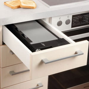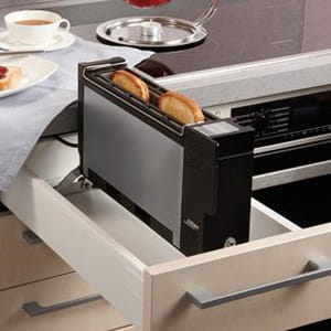 Toster BT 10 do zabudowy w szufladzie o szerokości korpusu od 30 cm. Toster ze szczeliną na 2 tosty. Toster do zabudowy BT 10 można podnieść jednym ruchem ręki i jest natychmiast gotowy do funkcjonowania w otwartej szufladzie. Obudowa izolująca ciepło i automatyczne wyłączenie przy złożeniu urządzenia, zapewniają wymagane bezpieczeństwo. Toster wyposażony jest w automatyczne, symetryczne ustawienie tostu w opiekaczu, funkcję rozmrażania i podgrzewania, ustawienie stopnia opiekania ze wskaźnikiem LED, przycisk „stop” oraz dołączoną do zestawu drucianą podkładkę do opiekania bułek. Kasetę na okruchy można opróżniać zarówno w pozycji leżącej, jak i stojącej. W celu wyczyszczenia, urządzenie można wymontować z szuflady bez użycia narzędzi.