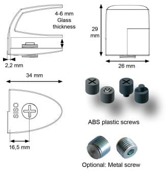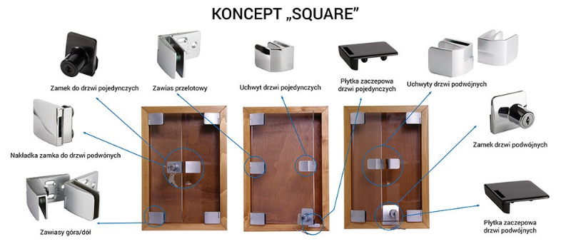 SQUARE linia okuć do budowy gablot lub mebli ze szklanymi drzwiczkami. Umożliwia ona budowę szafki z zawiasami, uchwytami i zamkami w jednolitej kolorystyce i kształcie. Uchwyt na drzwi podwójne serii SQUARE Zastosowanie: gabloty z szklanym frontem. Nie wymaga wiercenia w szkle.