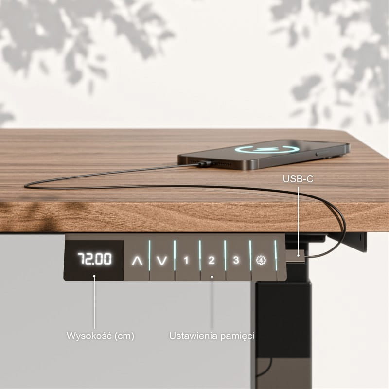 - Silnik i wydajność: podwójny silnik umożliwia stabilne podnoszenie i opuszczanie blatu z prędkością ok. 25 mm/s.