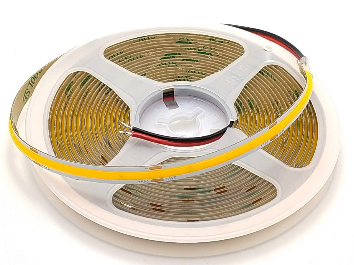 Taśma LED COB to innowacyjne rozwiązanie które pozwala uzyskać efekt jednolitej linii światła bez widocznych diod tzw. oświetlenie bezpunktowe. Jest to taśma wyposażona w nowoczesne diody COB (ang. Chip on Board). W przypadku diod COB łatwo jest uzyskać dużą moc i wysoki strumień świetlny. Konstrukcja taśmy COB jest uproszczona w porównaniu do taśmy LED SMD. Łatwiejszy jest również jej montaż. Taśma COB charakteryzuje się zwiększoną żywotnością oraz mniejszym poborem mocy niż jej odpowiednik w technologii SMD. Znajdzie ona zastosowanie jako oświetlenie zarówno użytkowe jak i dekoracyjne. Długość rolki taśmy wynosi 5 m, a szerokość 8 mm, jej moc to 10W / 1m, a strumień świetlny to aż 900lumenów / 1m. Taśmę można ciąć co 50 mm w zaznaczonych na taśmie miejscach.