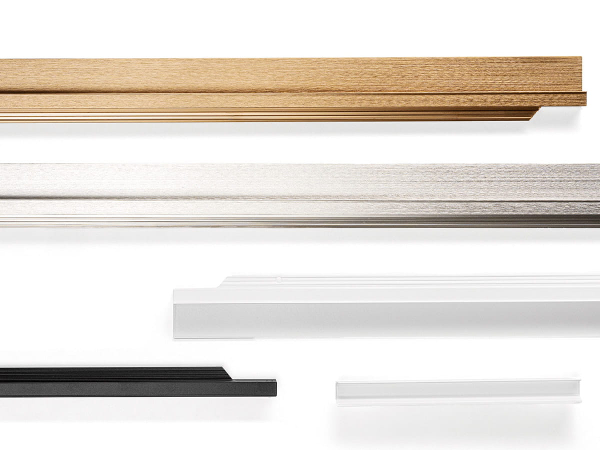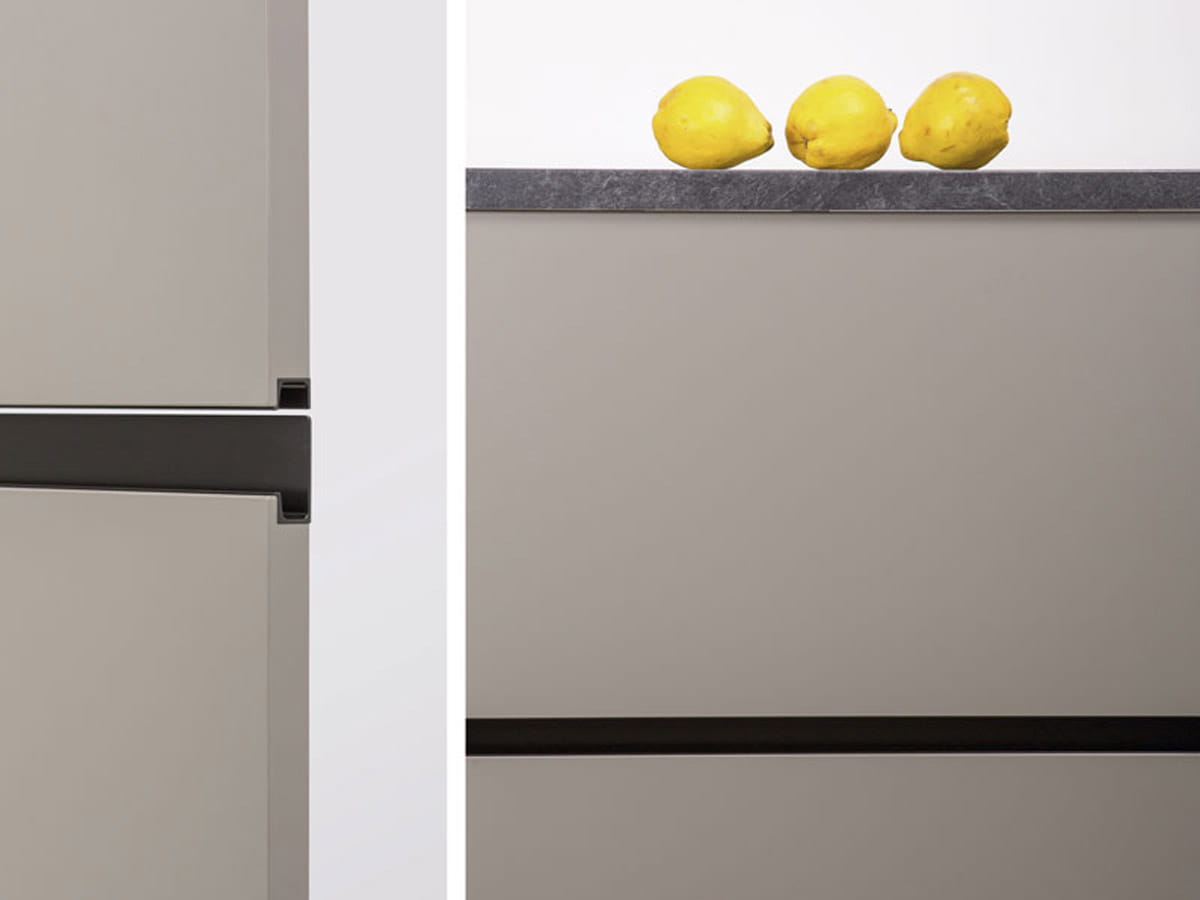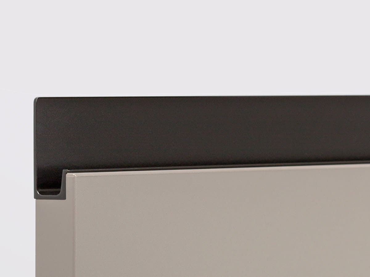 Jey2 to praktyczny uchwyt wykonany z profilu aluminiowego w kolorze szczotkowanego mosiądzu, przeznaczony do montażu na krawędziach mebli. Doskonale współgra z drzwiami o grubości od 18 mm, tworząc minimalistyczny design idealnie komplementujący się z modelem Jey.