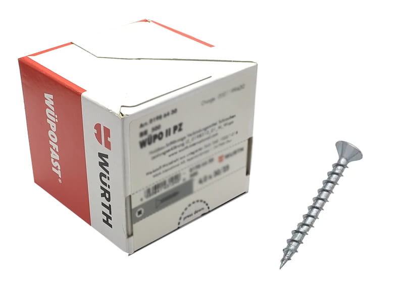 Wkręt do płyty wiórowej WÜPOFAST 2.0 stal ocynkowana, gwint pełen, łeb stożkowy płaski, końcówka PZ. Śruba, która wgryza się w materiał.