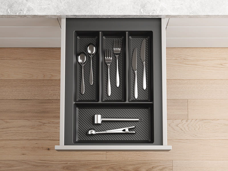 Organizery MAX wykonane są z wysokiej jakości tworzywa o grubości 2 mm, przy użyciu technologii formy wtryskowej, co przekłada się na ich solidność i odporność na uszkodzenia. To inwestycja na lata, która łączy w sobie estetykę, trwałość i wygodę codziennego użytkowania. Wybierając wkłady MAX, zyskujesz nie tylko idealnie uporządkowaną szufladę, ale też większy komfort pracy w kuchni i spójną, nowoczesną aranżację wnętrza.