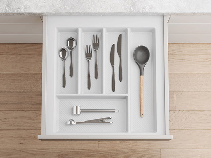 Wkłady organizery MAX to nowoczesne i funkcjonalne rozwiązanie, które doskonale sprawdzi się w każdej kuchni. Ich charakterystyczna, ryflowana struktura dna nie tylko zwiększa trwałość, ale także skutecznie zapobiega przesuwaniu się sztućców i innych drobnych przedmiotów podczas otwierania szuflady. Dodatkowo taka powierzchnia znacznie ułatwia utrzymanie czystości i porządku.