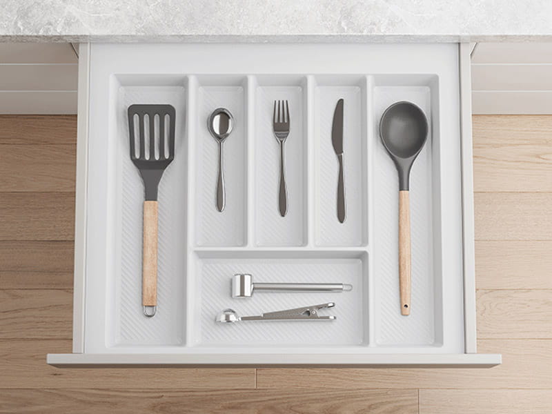 Organizery MAX wykonane są z wysokiej jakości tworzywa o grubości 2 mm, przy użyciu technologii formy wtryskowej, co przekłada się na ich solidność i odporność na uszkodzenia. To inwestycja na lata, która łączy w sobie estetykę, trwałość i wygodę codziennego użytkowania. Wybierając wkłady MAX, zyskujesz nie tylko idealnie uporządkowaną szufladę, ale też większy komfort pracy w kuchni i spójną, nowoczesną aranżację wnętrza.