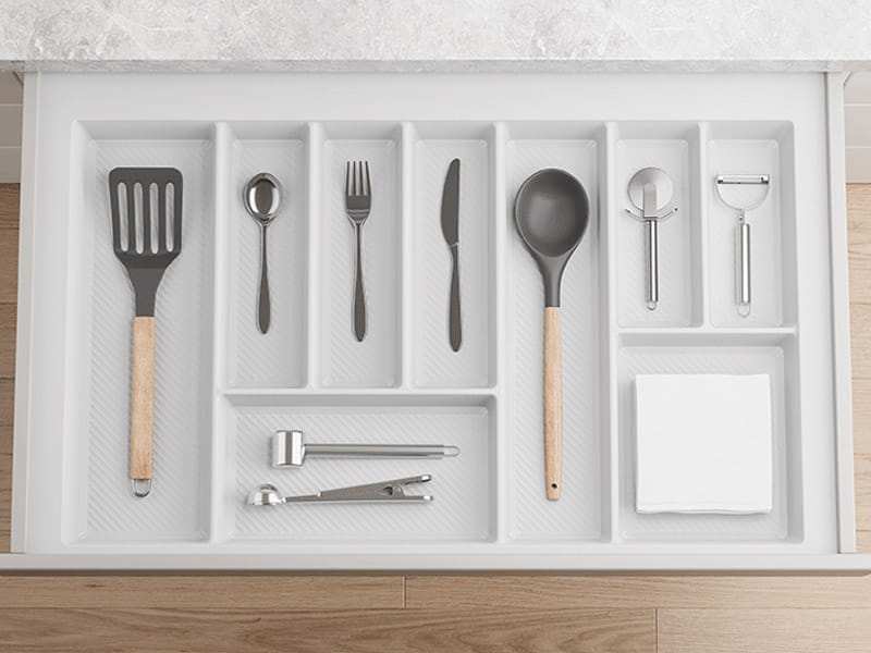 Organizery MAX wykonane są z wysokiej jakości tworzywa o grubości 2 mm, przy użyciu technologii formy wtryskowej, co przekłada się na ich solidność i odporność na uszkodzenia. To inwestycja na lata, która łączy w sobie estetykę, trwałość i wygodę codziennego użytkowania. Wybierając wkłady MAX, zyskujesz nie tylko idealnie uporządkowaną szufladę, ale też większy komfort pracy w kuchni i spójną, nowoczesną aranżację wnętrza.